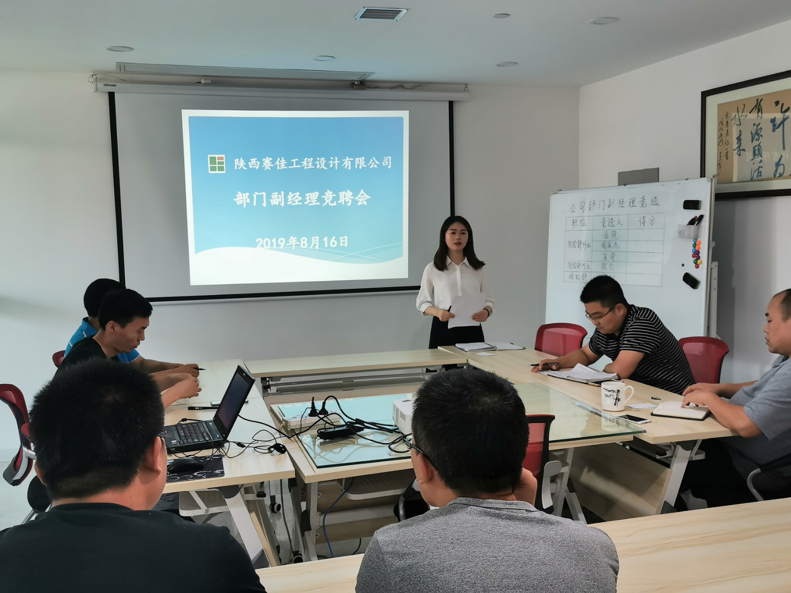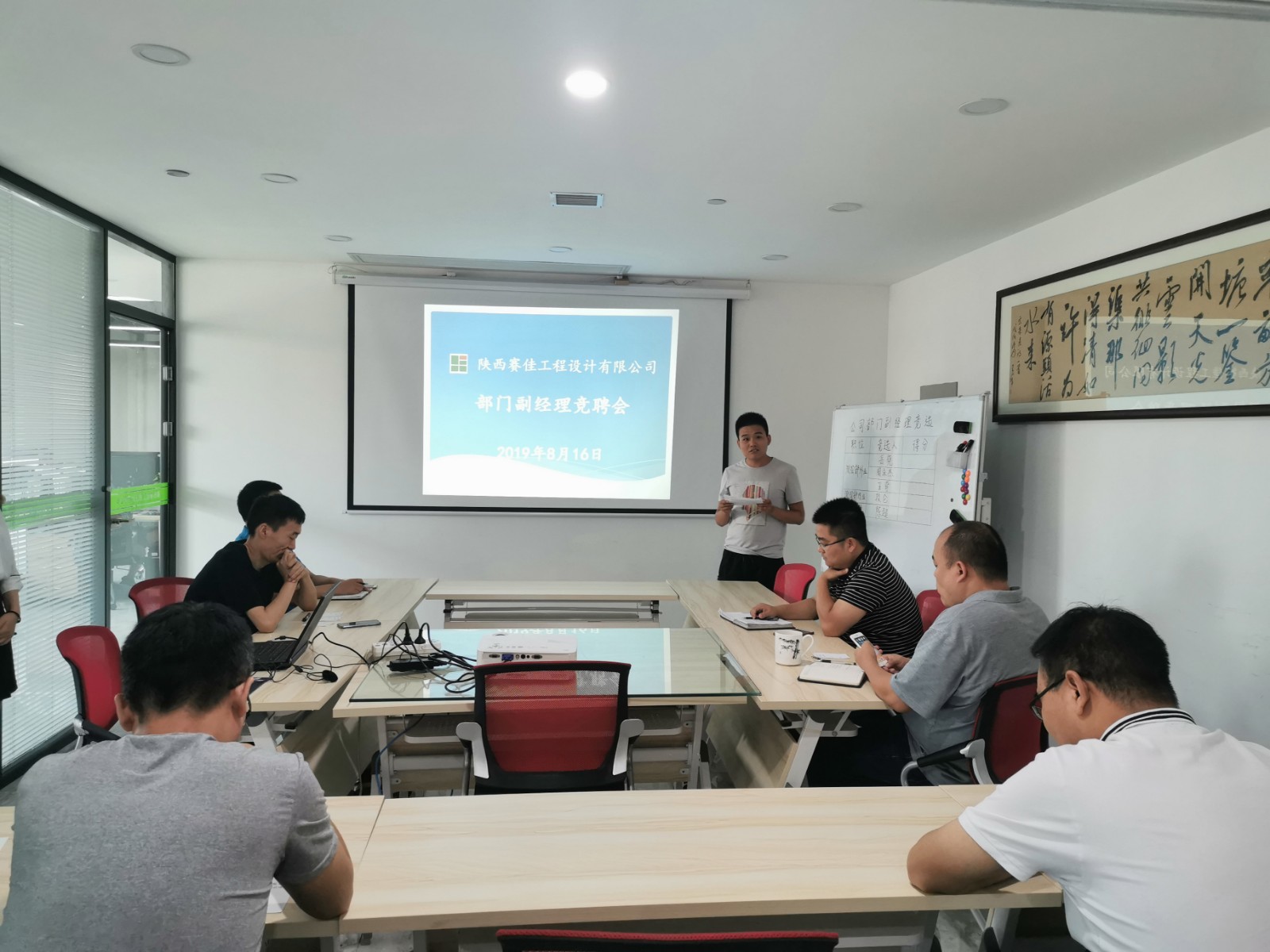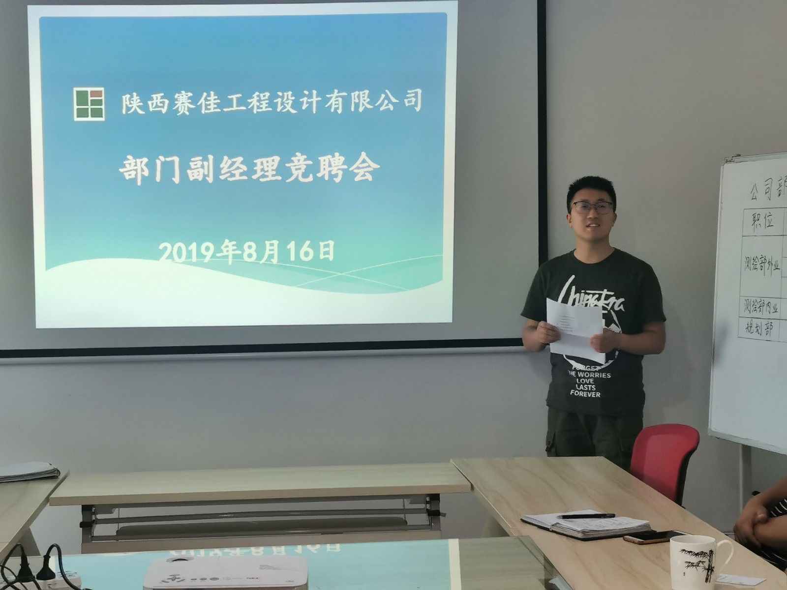 2019年8月16日中午,陜西賽佳在公司會議室召開了國土規劃部和測繪工程部部門副經理競聘會議。行政副總經理、技術副總經理、各部門經理及競聘人員參加了本次會議,會議由行政部主持。