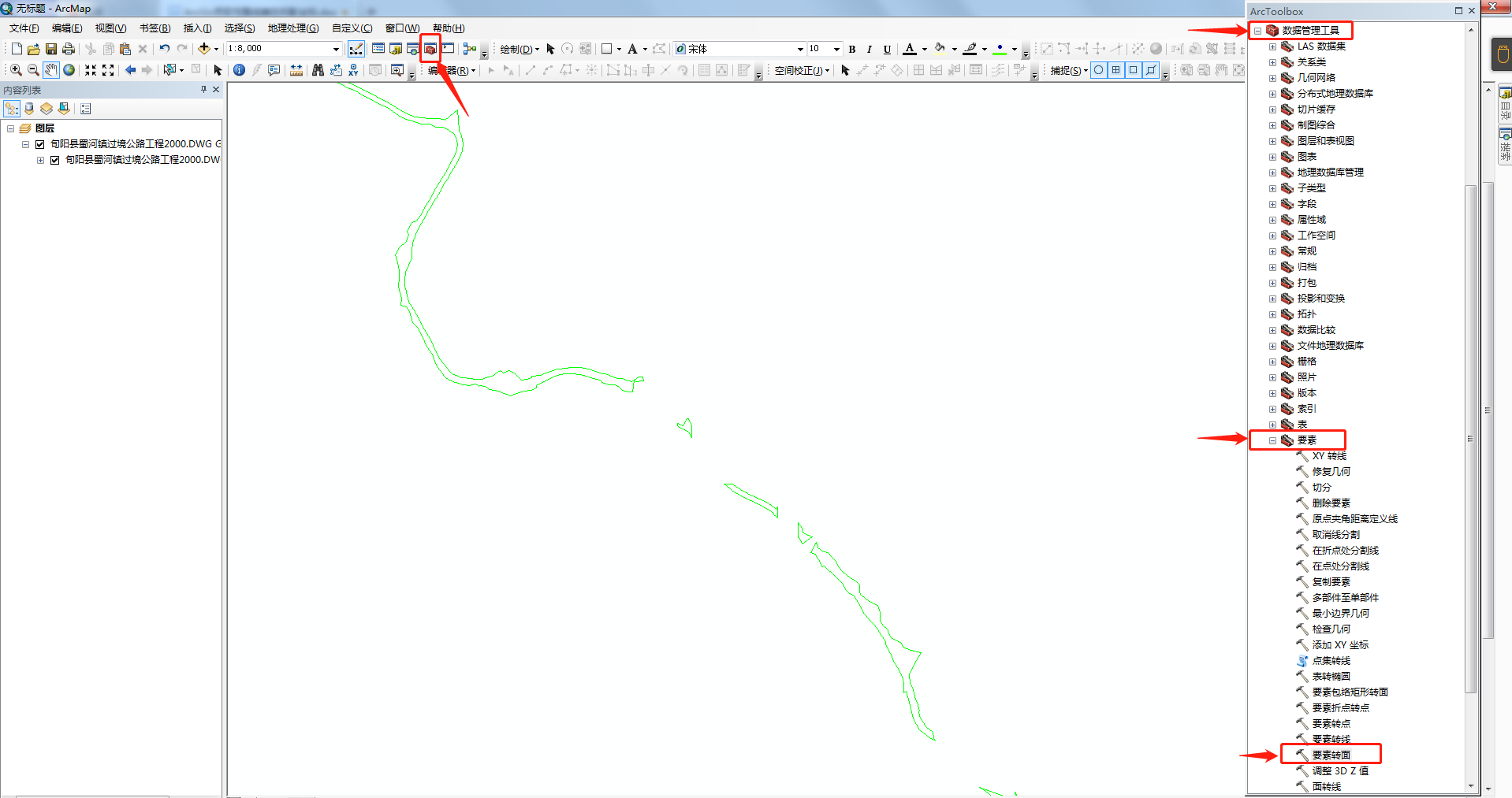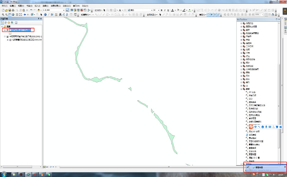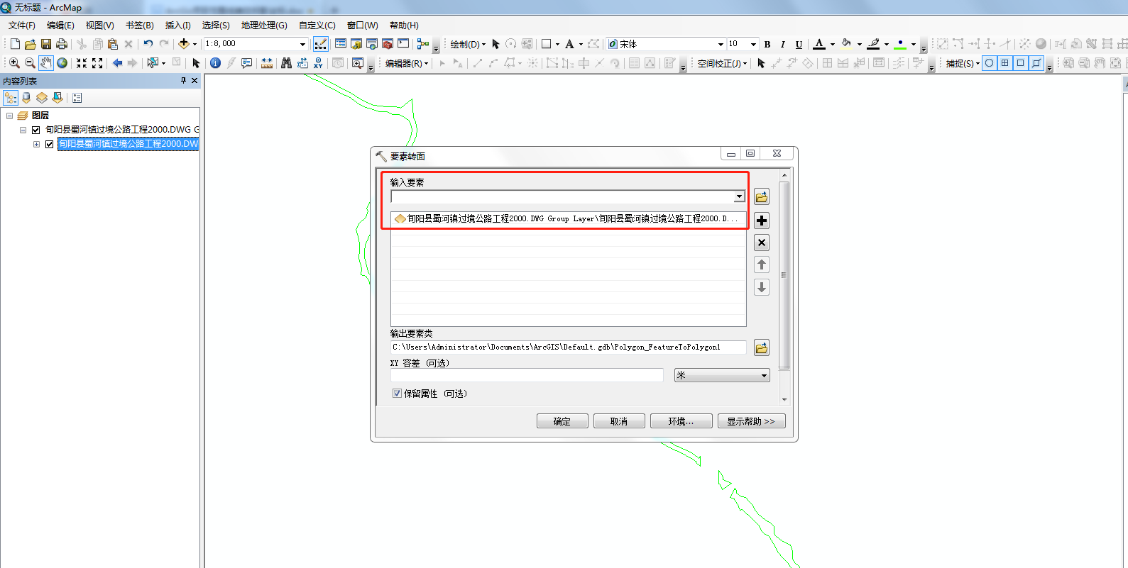 4. 因導入的數據是DWG格式,無法進行坐標頭像,還需將該范圍線轉成面。首先ArcToolbox-數據管理工具-要素-要素轉面-輸入要素(項目范圍線)-輸出要素(由DWG格式轉為SHP面之后)-文件儲存位置選定之后-點擊確定(轉面成功之后右下角會“√要素轉面”,如果失敗的會出現“×要素轉面”)